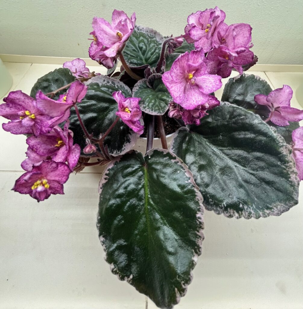 Maverick's Faded Jeans (W. Smith) Semidouble light blue pansy/darker top petals, green frilled edge. Medium green, pointed, serrated. (TX Hyb)